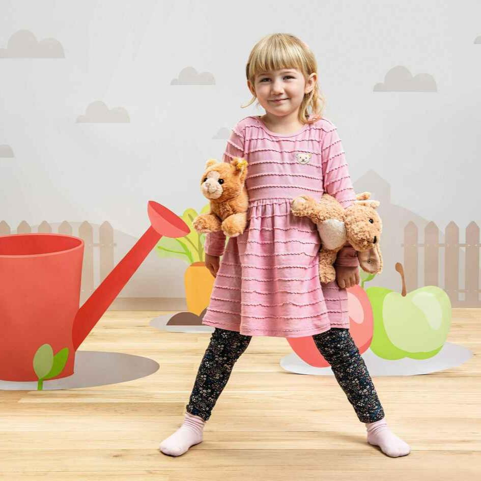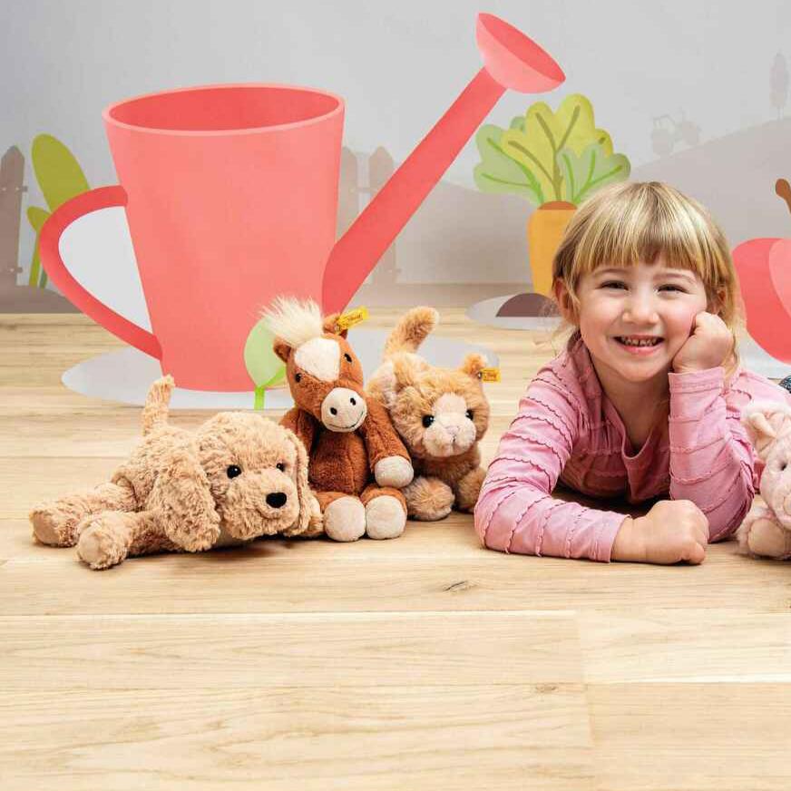 Measuring 10 inches in length, Steiff's Berno Goldendoodle puppy comes in a lying-down position with a slightly curly, beige-colored plush coat resembling that of a doodle puppy. His white, smooth plush chest and tummy offer a lovely contrast. His tummy and paws are lined with little bean bags, allowing Berno Goldendoodle to hold a sitting pose.