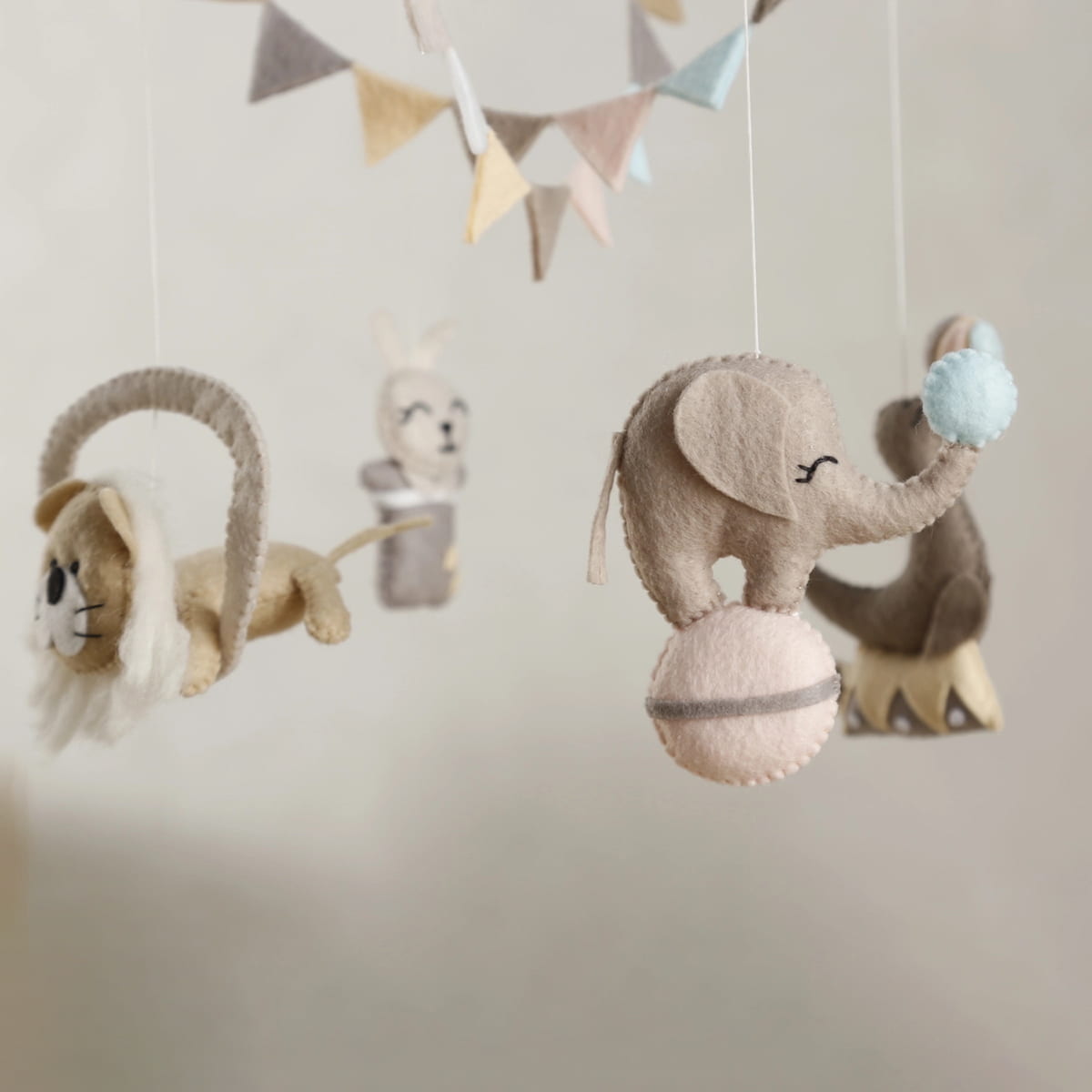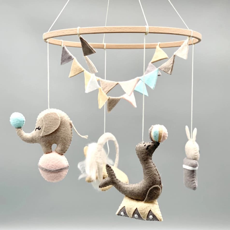 A circus out of a childhood dream. Rabbits that come out of a hat, lions jumping through fiery hoops, seals that spin balls on their snouts. All these fun animals are here playing together in this beautiful, handmade mobile.