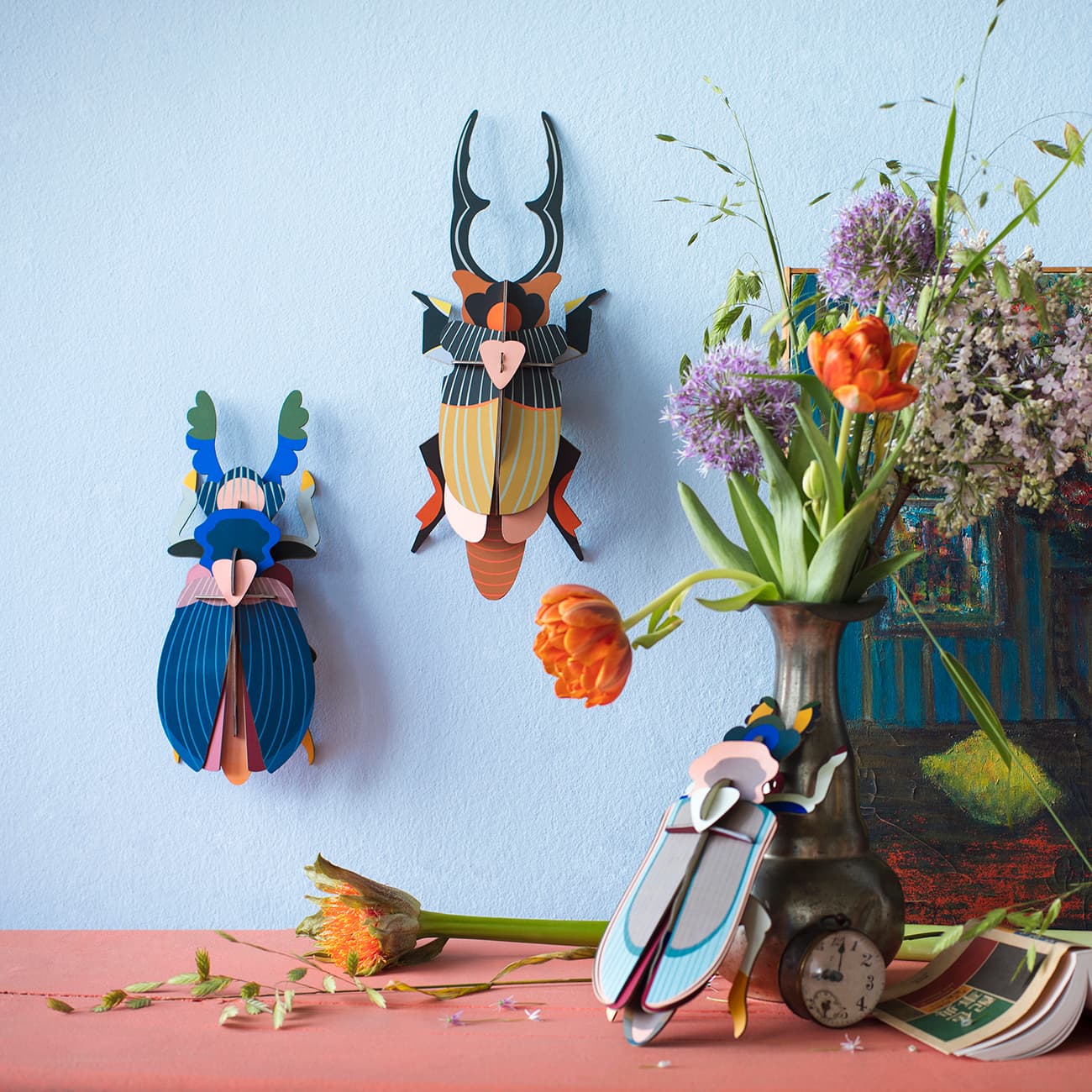 In real animal life, they inconspicuously scuttle about under leaves and on branches, but these flamboyant and colorful beetles – from every corner of the world – look as if they have just stepped off the catwalk. Give them a place among your artistic treasures, hang them on the wall, let them crawl around on your table and create your own insect story.