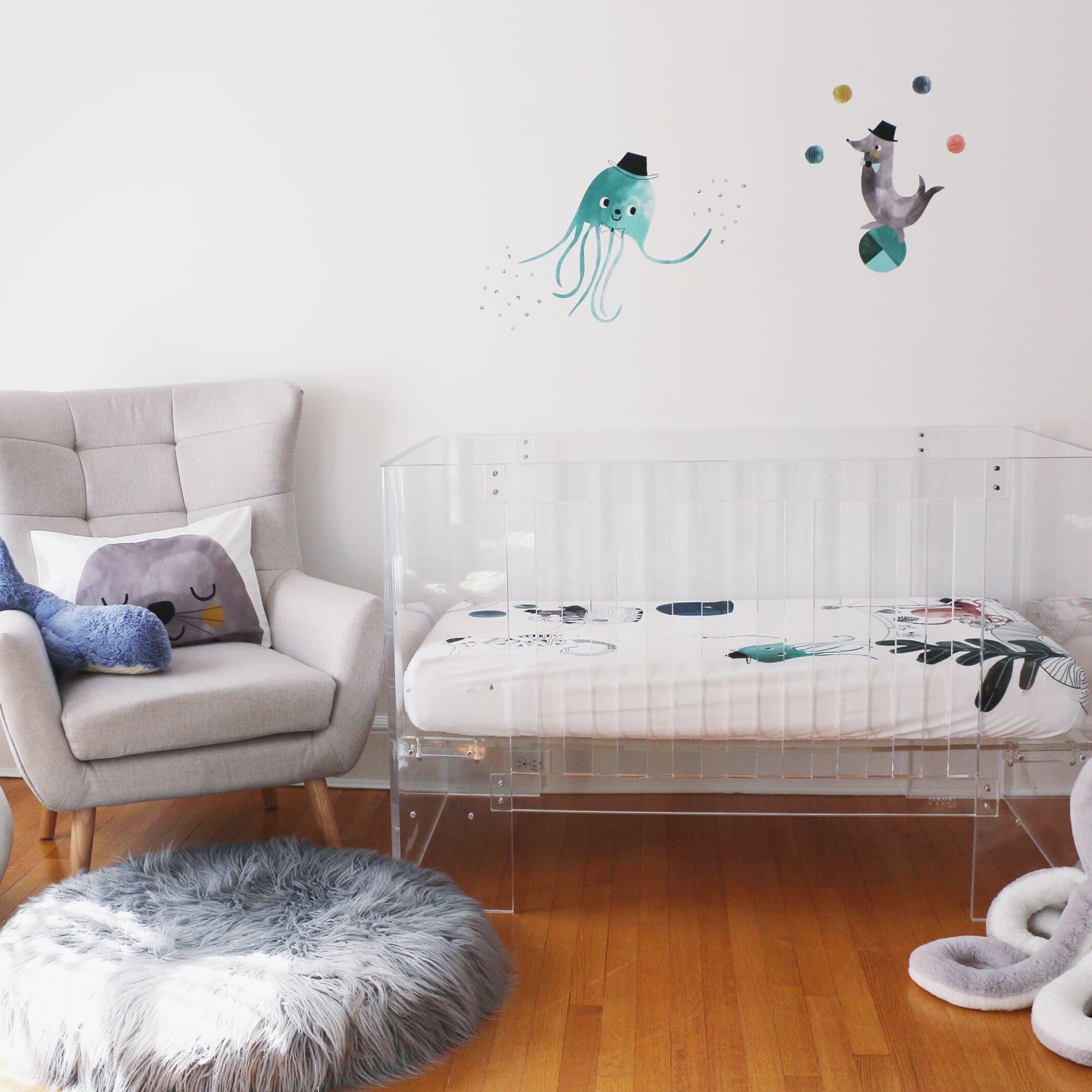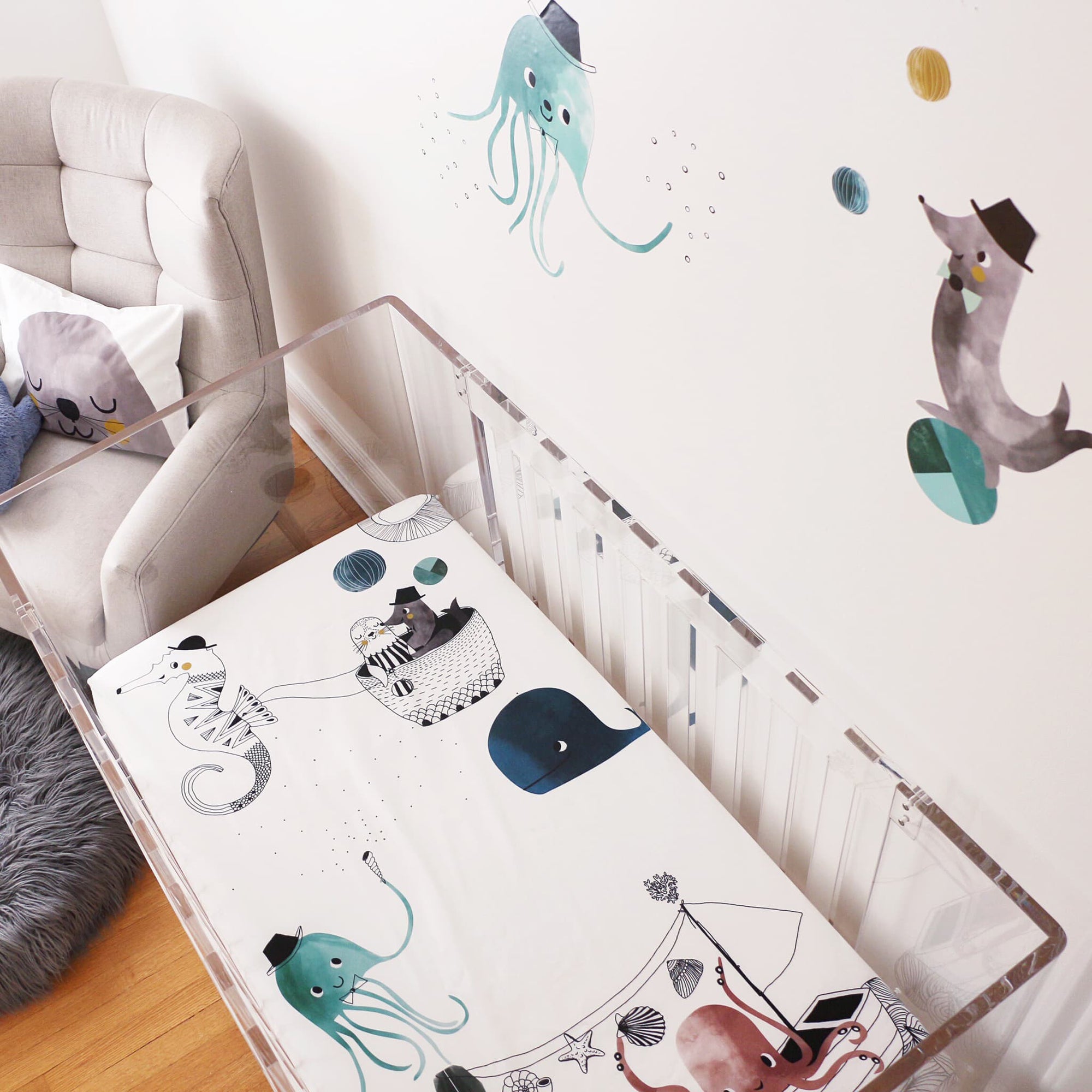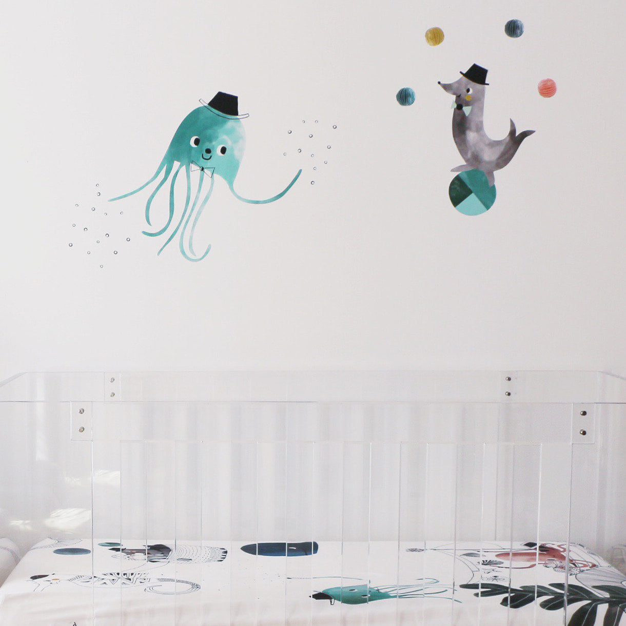 Our cheerful ocean-inspired wall decal is the perfect accent for your nursery wall. A fancy hat-wearing jellyfish and juggling seal bring fun and whimsy to your underwater themed nursery.