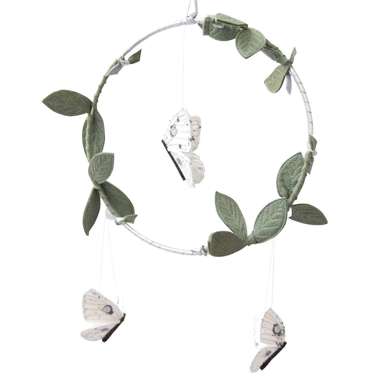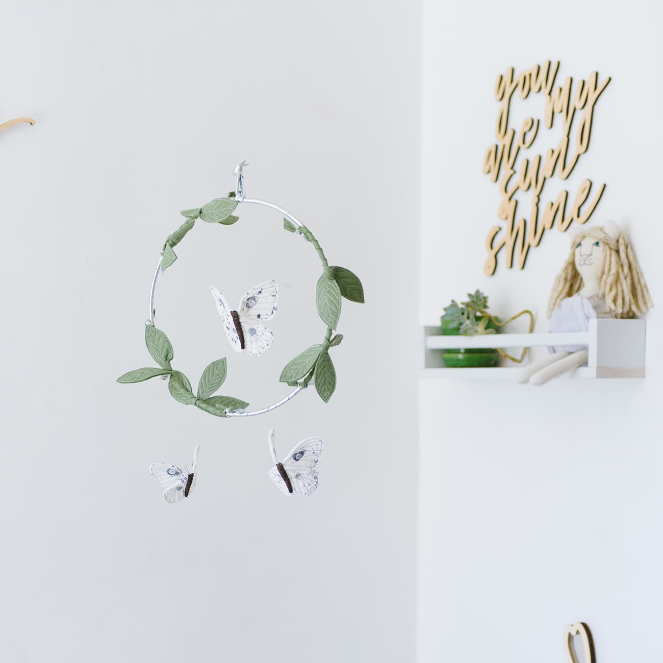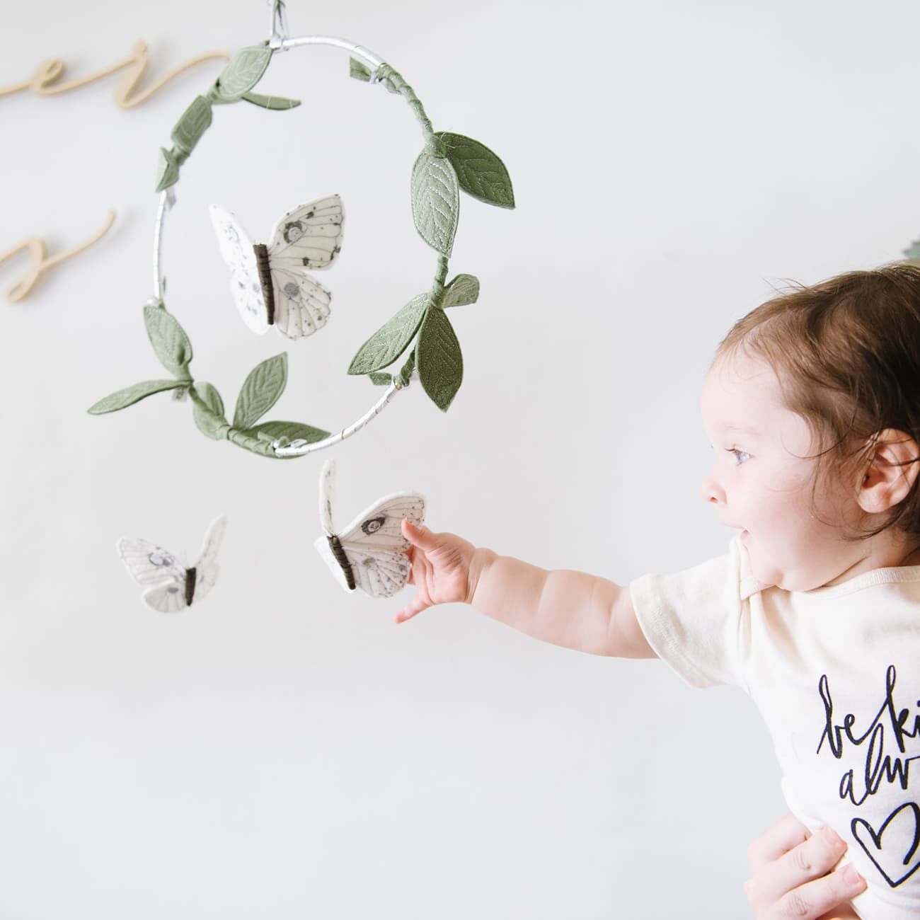 Bring a bit of garden magic into your home with Baby Jives' hand crafted luna moth mobile that glimmers in the light and spins with the slightest breeze.