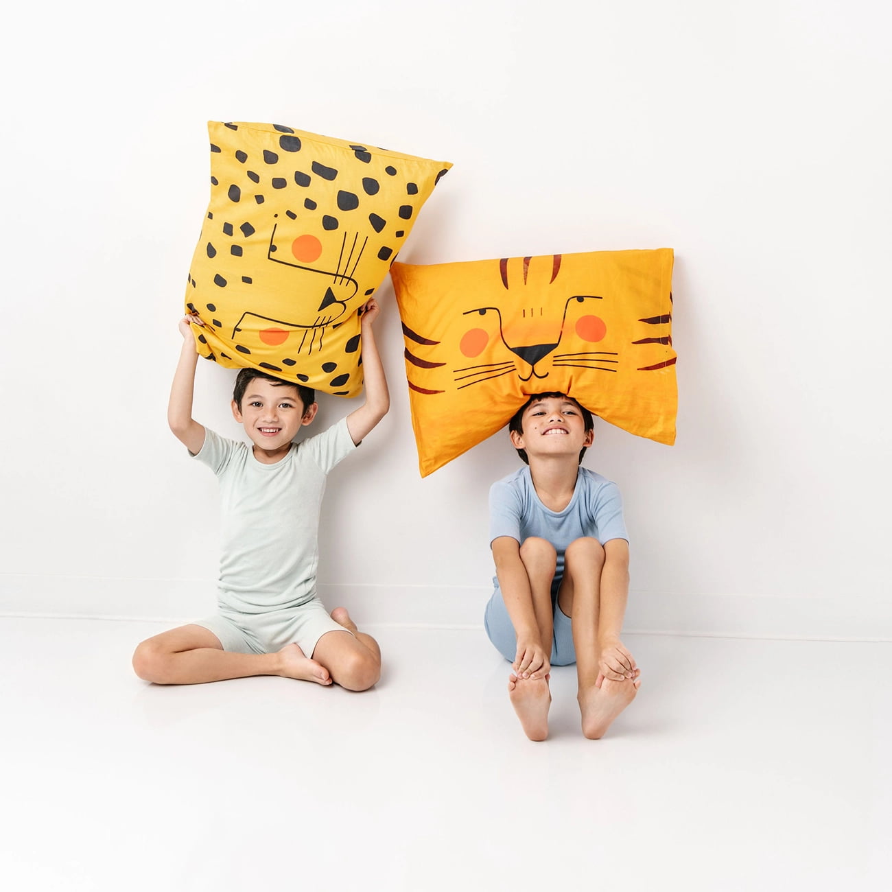 The set includes 2 pillowcases, 1 leopard and 1 tiger. The pillowcases have envelope closure to keep the pillow in place throughout all the tossing, turning and pillow-fighting.